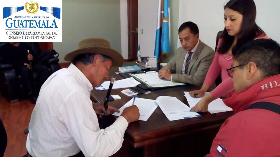 Hoy se llevó a cabo en las instalaciones del Consejo Departamental de Desarrollo de Totonicapán, el señor Juan Higinio Yax Say Gobernador de Totonicapán, Alcalde Municipal, COCODES del municipio de Santa Lucia la Reforma y Alcaldes Comunitarios del municipio de Totonicapán realizan la firma de Convenios que se ejecutarán en el presente Ejercicio Fiscal 2018 con fondos de Gobierno Central a través de éste Consejo